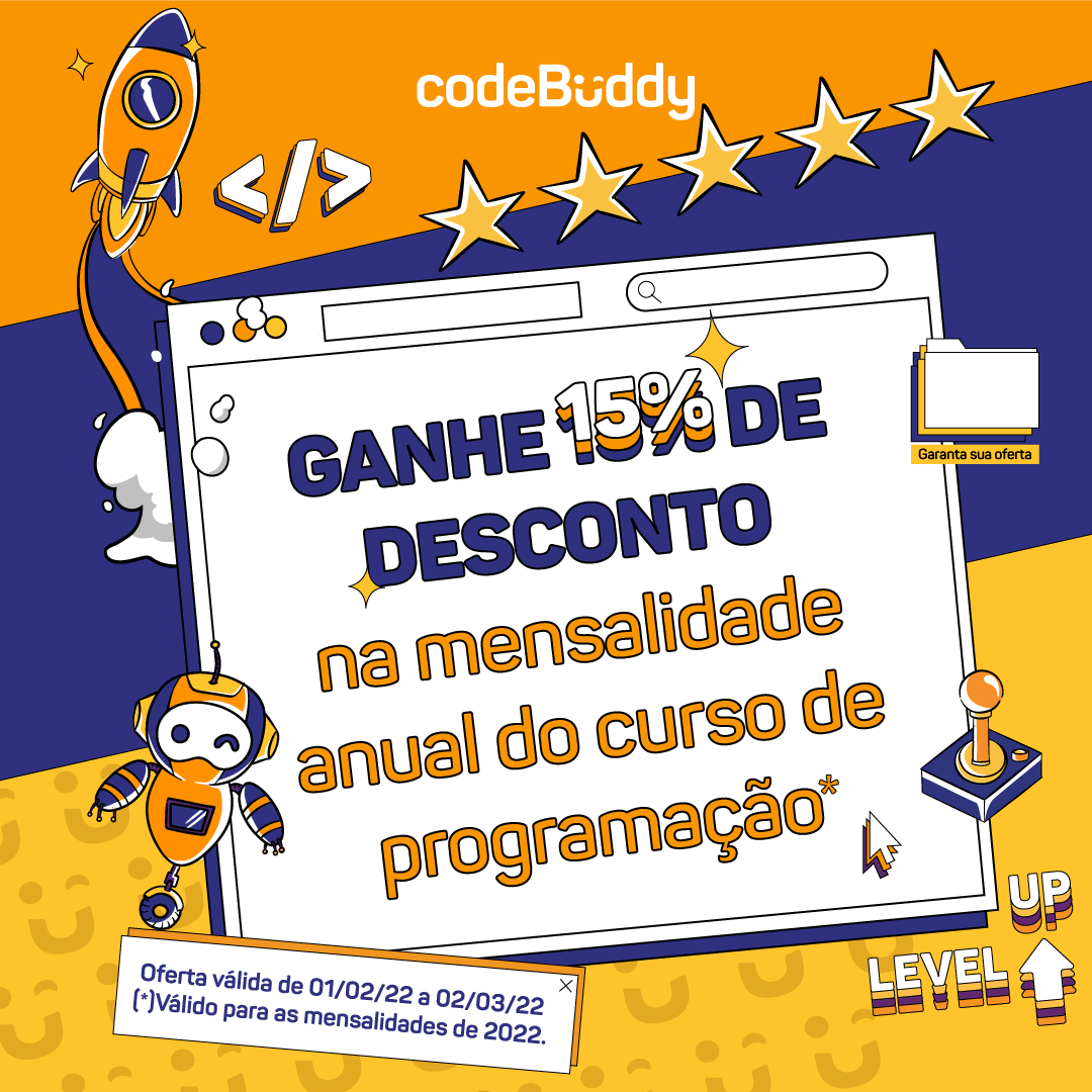 Fazendo sua inscrição durante o mês de fevereiro, você garante 15% de desconto na mensalidade anual do curso de programação!
