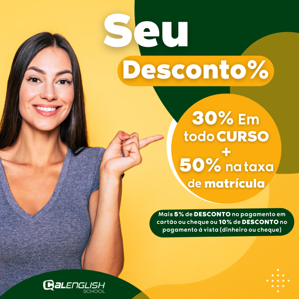 Temos uma OPORTUNIDADE única para começar o seu curso de INGLÊS aqui na CalEnglish! Mais 5% ou 10% de DESCONTO dependendo da forma de pagamento.